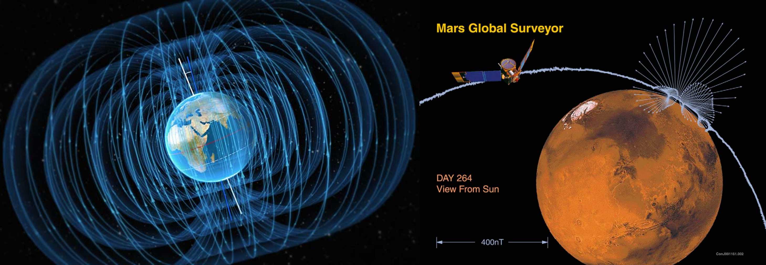 圖1. 地球和火星的對(duì)比。左圖為地球,地球存在由全球性的偶極地磁場(chǎng)?;鹦钱?dāng)前沒(méi)有全球性磁場(chǎng),但在表面(尤其南半球)廣泛分布著巖石剩磁。