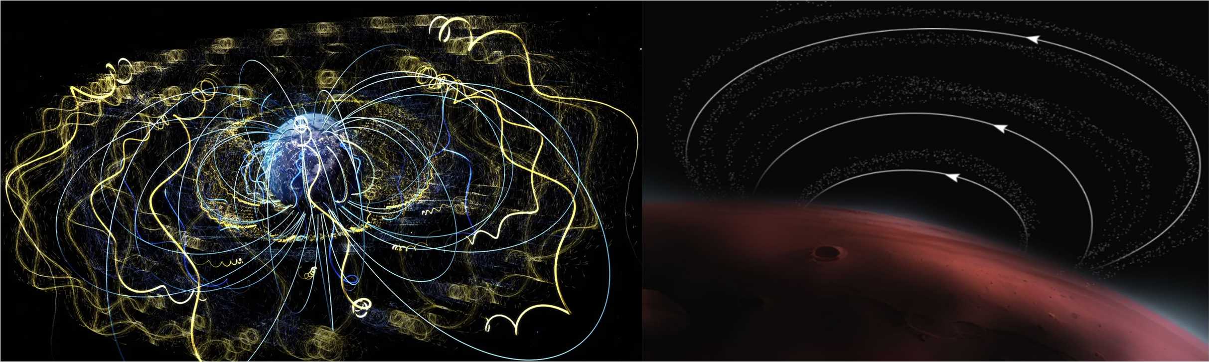 圖2. 左圖為帶電粒子在地磁場(chǎng)中的運(yùn)動(dòng)軌跡,其中藍(lán)線為磁力線,黃色曲線代表粒子的運(yùn)動(dòng)軌跡。捕獲粒子會(huì)圍繞磁力線進(jìn)行回旋運(yùn)動(dòng),在南北極進(jìn)行彈跳運(yùn)動(dòng),同時(shí)會(huì)圍繞著地球進(jìn)行漂移運(yùn)動(dòng)。右圖為火星表面小尺度的殼磁場(chǎng)結(jié)構(gòu)。?