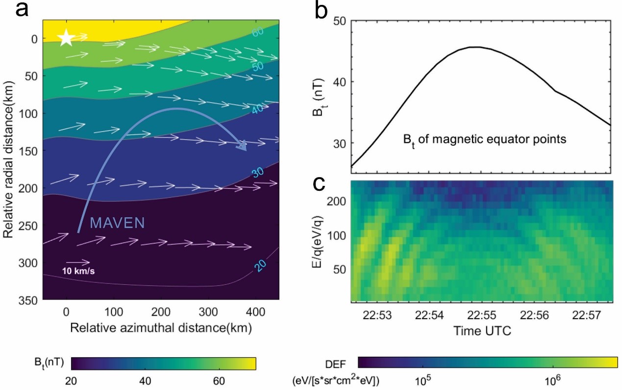 圖 3. (a)在殼磁場(chǎng)磁赤道平面上的磁場(chǎng)強(qiáng)度空間分布。 (b) MAVEN所穿越的磁力線,其對(duì)應(yīng)在磁赤道面上的磁場(chǎng)強(qiáng)度時(shí)許分布。(c) 離子能譜。