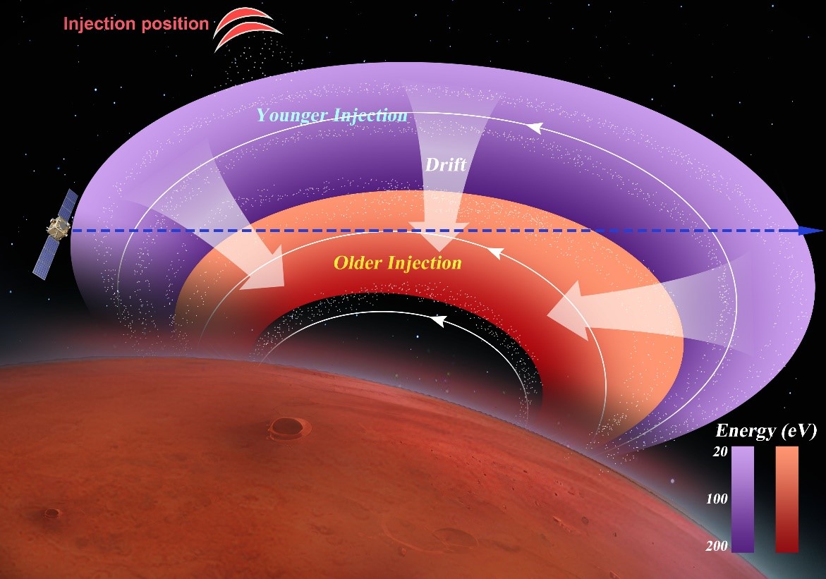 具體來(lái)說(shuō),他們?cè)跈z查了大量的觀測(cè)事件后,發(fā)現(xiàn)當(dāng)MAVEN飛船穿越火星殼磁場(chǎng)區(qū)域時(shí),有時(shí)會(huì)探測(cè)到離子能譜呈現(xiàn)出“先上升—后下降”的能量色散結(jié)構(gòu)(圖3)。這一色散現(xiàn)象在地球磁層環(huán)電流附近的觀測(cè)中很普遍,實(shí)際上就是捕獲離子漂移運(yùn)動(dòng)的直接反映——不同能量的離子在空間中有著不同的漂移軌跡。當(dāng)飛船穿越殼磁場(chǎng)區(qū)域時(shí),在時(shí)序上會(huì)記錄到不同能量的離子,從而會(huì)顯示出這些色散結(jié)構(gòu)特征。經(jīng)過(guò)深入的數(shù)據(jù)解析,我們發(fā)現(xiàn)這些捕獲離子(主要成分為H+)并非來(lái)源于火星,而是來(lái)源于太陽(yáng)風(fēng)。這表明太陽(yáng)風(fēng)與殼磁場(chǎng)的相互作用發(fā)生了某種物理過(guò)程,使太陽(yáng)風(fēng)離子得以注入到火星殼磁場(chǎng)中。同時(shí)離子的漂移運(yùn)動(dòng)使得高(低)能量的離子傾向于分布在火星殼磁場(chǎng)的內(nèi)部(外部)區(qū)域(參見(jiàn)圖3和圖4)。
