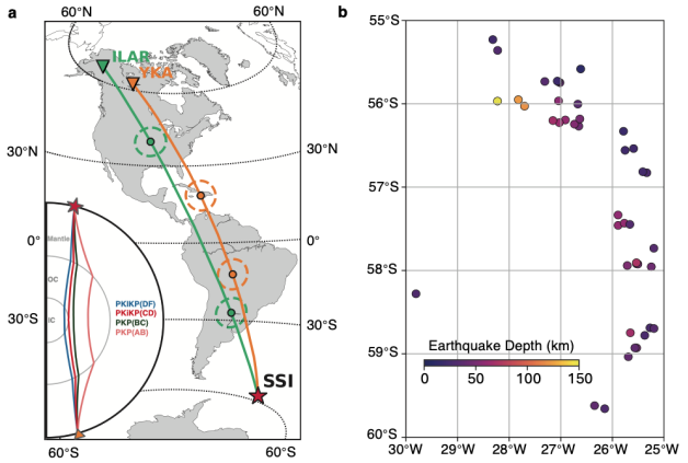 隨著地震學(xué)觀測(cè)的積累和研究方法的創(chuàng)新,地震學(xué)家對(duì)于地球內(nèi)核運(yùn)動(dòng)狀態(tài)的認(rèn)識(shí)逐漸深入。最近,中國(guó)科學(xué)院地質(zhì)與地球物理所地球與行星物理重點(diǎn)實(shí)驗(yàn)室王巍副研究員與美國(guó)南加州大學(xué)John Vidale教授、美國(guó)康奈爾大學(xué)龐冠寧博士后、猶他大學(xué)Keith Koper教授和美國(guó)南加州大學(xué)博士生王若妍等合作,對(duì)1990-2023年間在加拿大(Yellowknife Array,YKA)和美國(guó)(Eielson Array,ILAR)的地震臺(tái)陣記錄到的南三明治島(South Sandwich Island,SSI)的重復(fù)地震(圖1)記錄開(kāi)展了詳細(xì)分析,揭示了近20年來(lái)內(nèi)核差速旋轉(zhuǎn)的振蕩軌跡,明確給出了內(nèi)核振蕩運(yùn)動(dòng)模式的地震學(xué)證據(jù)。