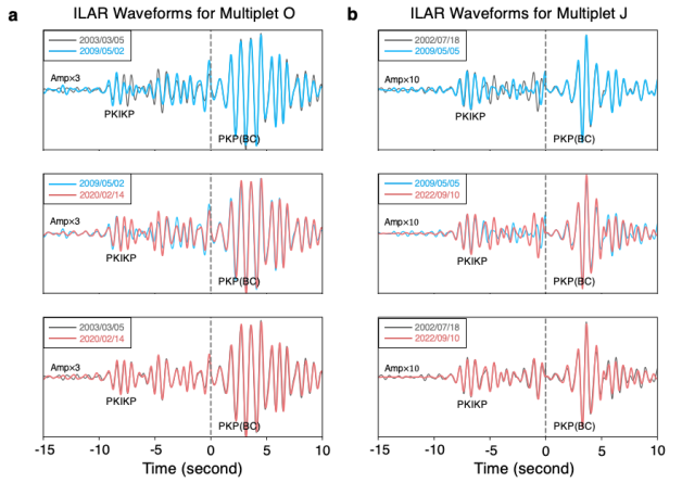 重復(fù)地震是指幾乎在同一個(gè)位置發(fā)生、震級(jí)接近,同時(shí)震源機(jī)制幾乎一樣的地震。這樣的重復(fù)地震在同一臺(tái)站上的記錄幾乎完全一致(圖2)。他們通過(guò)對(duì)比發(fā)現(xiàn),當(dāng)?shù)卣鸩](méi)有通過(guò)內(nèi)核的時(shí)候,重復(fù)地震在YKA和ILAR臺(tái)陣上的記錄幾乎完全一致;但是內(nèi)核存在差速旋轉(zhuǎn),不同時(shí)間發(fā)生的重復(fù)地震輻射的地震波經(jīng)過(guò)內(nèi)核時(shí)的路徑會(huì)發(fā)生變化,從而會(huì)引起地震波到時(shí)和波形的變化。特別是穿過(guò)內(nèi)核的地震波PKIKP(見(jiàn)圖1a)的尾波,它是由內(nèi)核中分布的小尺度異常體的散射所產(chǎn)生(Wang and Vidale, 2022),其波形受路徑上介質(zhì)變化的影響尤為顯著,對(duì)于內(nèi)核差速旋轉(zhuǎn)也更加敏感(圖2)。反之,如果地震對(duì)的PKIKP和其尾波的波形一致,則PKIKP經(jīng)過(guò)內(nèi)核的路徑幾乎一樣,進(jìn)一步得知內(nèi)核處在完全相同的位置。
