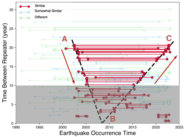 圖3 重復(fù)地震波形相似性比對(duì)圖。直線連著兩個(gè)地震對(duì),紅色代表著波形完全一致的地震對(duì)