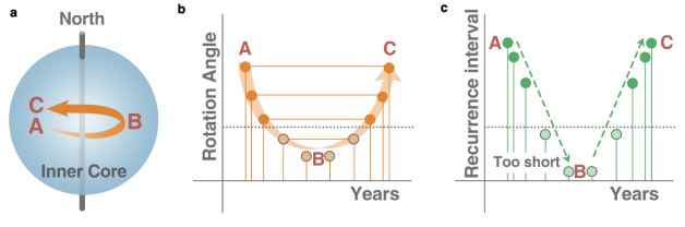 通過(guò)分析重復(fù)地震對(duì)的PKIKP和其尾波波形相似性隨時(shí)間的分布規(guī)律,發(fā)現(xiàn)記錄相同波形的重復(fù)地震對(duì)中,第一個(gè)地震在2003-2005年和對(duì)應(yīng)的第二個(gè)地震在2015-2023之間的重復(fù)地震對(duì)之間間隔時(shí)間隨著時(shí)間推移逐漸變短(圖3和圖4c),基于此,他們推測(cè)出內(nèi)核處于振蕩狀態(tài)(圖4)。通過(guò)線性擬合發(fā)現(xiàn),內(nèi)核大約在2008年左右相對(duì)改變旋轉(zhuǎn)方向,且兩個(gè)時(shí)間段的旋轉(zhuǎn)速率不同,即內(nèi)核在2003至2008年之間超速旋轉(zhuǎn)(super-rotate)和2008年至2023年之間的慢速旋轉(zhuǎn)(sub-rotate),同時(shí)超速旋轉(zhuǎn)速率大約為慢速旋轉(zhuǎn)的2~3倍。