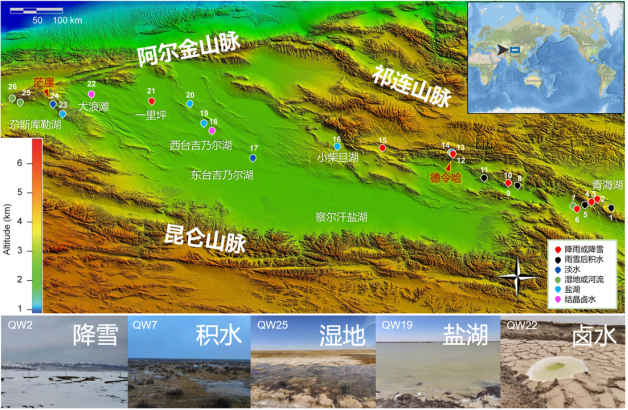 中國(guó)科學(xué)院地質(zhì)與地球物理研究所地球與行星磁場(chǎng)及宜居性學(xué)科組的申建勛博士后與合作導(dǎo)師林巍研究員,聯(lián)合中國(guó)科學(xué)院頁(yè)巖氣與地質(zhì)工程重點(diǎn)實(shí)驗(yàn)室的黃天明研究員等,在柴達(dá)木盆地緯向中軸線的典型類火星環(huán)境中,沿干旱梯度分別采集了大氣降水、雨/雪后積水、濕地、鹽湖、鹵水等不同類型共計(jì)26個(gè)水樣(圖1),對(duì)這些樣品開展了系統(tǒng)的水化學(xué)和同位素研究。