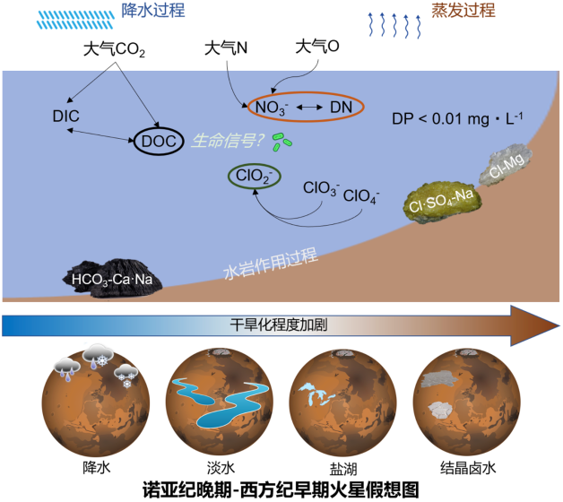 研究發(fā)現(xiàn)隨著蒸發(fā)程度的加劇,樣品中的陰離子從碳酸(氫)根離子型逐漸演變?yōu)榱蛩岣x子/氯離子混合型甚至氯離子型,陽(yáng)離子則從以鈣/鈉離子混合型為主逐漸變?yōu)橐枣V離子或鈉離子為主(圖2),這與火星上的鹽分特征相似,暗示了火星上可能曾經(jīng)歷過(guò)類似的蒸發(fā)過(guò)程。其中在結(jié)晶度最高的水樣中碳酸(氫)根離子低于飽和值,表明存在碳酸(氫)根離子流失的途徑,例如在酸性環(huán)境中形成氣態(tài)二氧化碳等過(guò)程。這些水化學(xué)演化特征可能有助于解釋火星表面碳酸鹽礦物難探測(cè)的現(xiàn)象。無(wú)機(jī)碳與有機(jī)碳同位素的分析結(jié)果表明,柴達(dá)木水環(huán)境中可能存在微生物固碳作用、生物源貧13C碳酸鹽流失、河流或大氣富13C碳酸鹽累積等生命和非生命過(guò)程(圖2)。硝酸根離子中的氮氧同位素與水分子氧同位素和大氣氮同位素的比較研究,指示了在蒸發(fā)程度較低的區(qū)域中存在依賴生命活動(dòng)參與的硝酸鹽-水氧同位素交換以及硝酸鹽還原作用(圖2)。進(jìn)一步結(jié)合鹵氧化物和溶解磷含量檢測(cè),發(fā)現(xiàn)在蒸發(fā)作用較強(qiáng)的水環(huán)境中已經(jīng)存在鹵氧化物保存和形成的條件,低于檢出下限的磷可能是水生微生物的限制性營(yíng)養(yǎng)元素。該研究揭示了柴達(dá)木盆地的水化學(xué)和同位素信號(hào)的變化及其生命信號(hào)的保存特征,為認(rèn)識(shí)早期火星潛在生境中的水化學(xué)、氧化脅迫、營(yíng)養(yǎng)元素、同位素信號(hào)等天體生物學(xué)相關(guān)研究問題提供了啟示。