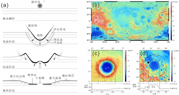 圖1 撞擊坑形成過程及形態(tài)學(xué)特征(a)、月球地形(b)、小尺寸撞擊坑(c)和大尺寸撞擊盆地(d)的表面和殼幔界面起伏特征