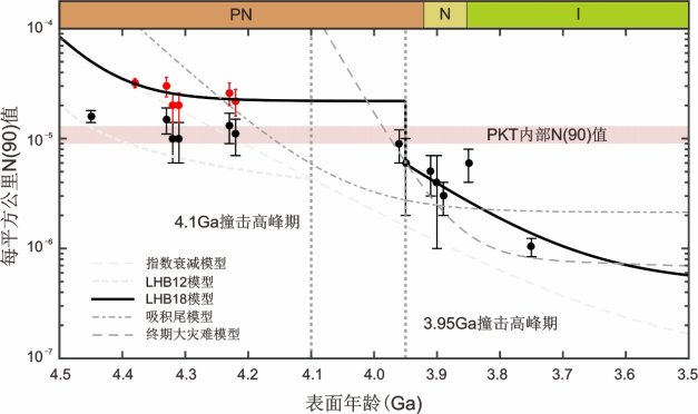 他們從撞擊坑統(tǒng)計定年的角度討論了月球早期撞擊通量。由于一些古老盆地被后期火山活動噴發(fā)的玄武巖覆蓋,利用統(tǒng)計定年的方法分析盆地年齡時,只能選取與盆地形成有關(guān)的濺射毯或殘存區(qū)域,統(tǒng)計區(qū)域的不確定性會對結(jié)果產(chǎn)生影響。匯編了地形撞擊坑和隱伏撞擊坑數(shù)據(jù)庫,將統(tǒng)計區(qū)域擴(kuò)展到整個盆地內(nèi)部,獲取了這些古老盆地的撞擊坑密度和相對年齡,并從兩個方面對月球早期撞擊通量進(jìn)行了約束:(1)重新估計了年齡在35~40億年的撞擊盆地的N(90)值;(2)估計了年齡>40億年的撞擊盆地的N(90)值,并根據(jù)撞擊坑密度與月殼孔隙度之間的經(jīng)驗(yàn)關(guān)系校正了達(dá)到撞擊平衡的盆地的N(90)值。最終的N(90)估計值與已有的月球早期撞擊通量模型進(jìn)行了對比驗(yàn)證,結(jié)果與39.5億年晚期重轟擊模型(LHB18模型)吻合較好(圖2)。