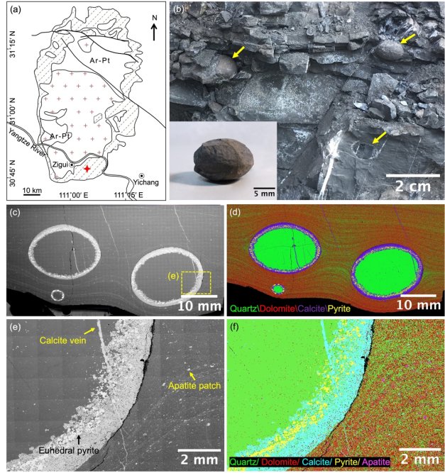湖北宜昌三峽九龍灣剖面埃迪卡拉系陡山沱組發(fā)育完整、出露連續(xù)、變質程度低,是開展該時期古環(huán)境、古生物與地層學研究的理想剖面(圖1a)。該剖面陡山沱組二段下部的黑色頁巖中廣泛發(fā)育大量的硅質結核(圖1b)?;趻呙桦婄R的大面積自動礦物分析結果顯示,硅質結核由三部分組成(圖1c-圖1d),從內到外依次是:石英核,自形黃鐵礦邊及方解石外緣;結核周圍的圍巖由層狀白云石、石英和粘土礦物組成,含少量方解石、磷灰石和黃鐵礦。結核圍巖的微紋層厚度從幾十微米到幾百微米不等,并圍繞結核彎曲展布(圖1e-圖1f),表明結核在早期成巖過程中固結,因此有效地抵抗了后期的成巖改造和壓實。