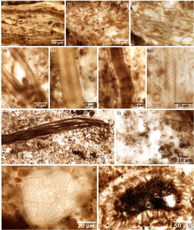 圖3 九龍灣段陡山沱組Ⅱ段硅質結核內的微化石光學顯微照片。(a) Siphonophycus septatum;(b) Siphonophycus robustum;(c) Siphonophycus typium; (d) Siphonophycus kestron;(e) Siphonophycus solidum;(f) Salome hubeiensis; (g) Obruchevella parva;(h) Polytrichoides lineatus;(i) Myxococcoides;(j) Wengania minuta;(k) Tianzhushania spinosa