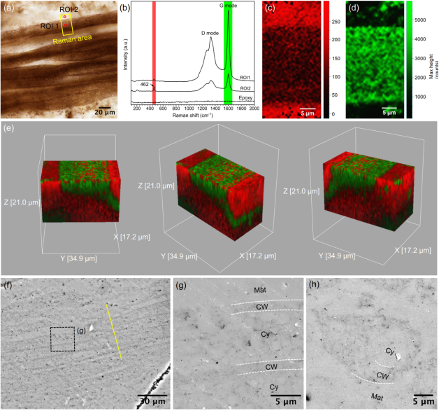 圖4 絲狀微化石Polytrichoides lineatus (P. lineatus)的拉曼顯微光譜和掃描電鏡分析。(a) P. lineatus的光學顯微照片;(b) 微化石體、相鄰非化石基質以及制備巖相薄片的環(huán)氧樹脂所對應的拉曼光譜;(c,d) 圖像(a)中黃色實線框指示區(qū)域的石英(436-481 cm-1) (c)和碳質材料(1531-1660 cm-1) (d)的二維拉曼圖像;(e) 圖像(a)中黃色實線框指示區(qū)域的三維拉曼圖像;(f) P. lineatus的背散射掃描電鏡圖像;黃色實線顯示FIB-SEM切割位置;(g) 圖像(f)中的黑色虛線框指示區(qū)域的放大圖像;(h) P. lineatus的背散射掃描電鏡圖像(斜剖面);細胞壁(或細胞外鞘) (CW);細胞質(Cy);非化石基質(Mat)