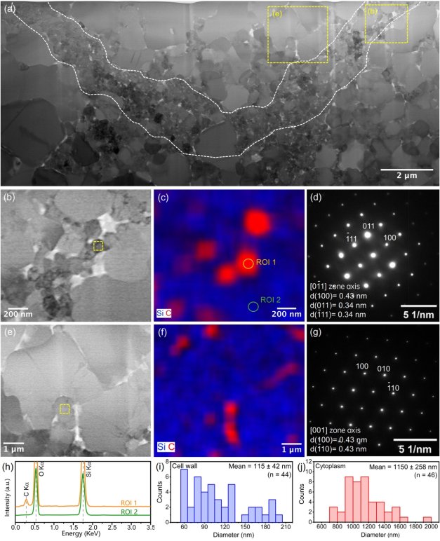 圖5 絲狀微化石Polytrichoides lineatus的透射電鏡特征。(a) 圖像4f中黃色實線對應位置獲得的超薄切片的部分HAADF-STEM圖像。白色雙曲線指示細胞壁或細胞外鞘的位置;(b) 圖像(a)中黃色虛線框指示區(qū)域的放大圖像,顯示細胞壁或細胞外鞘內的納米級石英顆粒;(c) 圖像(b)對應的Si(藍色)和C(紅色)的元素空間分布的疊加圖;(d) 圖像(b)中的黃色虛線框指示區(qū)域的SAED圖像,對應石英晶粒的[0-11]帶軸;(e) 圖像(a)中黃色虛線框指示區(qū)域的放大圖像,顯示細胞質內的微米級石英顆粒;(f) 圖像(e)對應的Si(藍色)和C(紅色)的元素空間分布的疊加圖;(g) 圖像(e)中的黃色虛線框指示區(qū)域的SAED圖像,對應石英晶粒的[001]帶軸;(h) 圖像(c)中ROI 1(富碳物質)和ROI 2(石英顆粒)標記區(qū)域的STEM-EDXS譜圖;(i,j) 細胞壁(或細胞外鞘) (i)和細胞質(j)中石英顆粒的粒徑分布