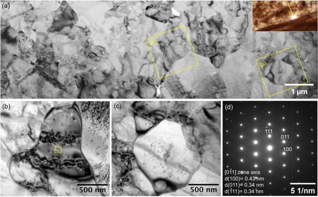 圖6 絲狀微化石Polytrichoides lineatus相鄰的非化石基質的透射電鏡特征。(a) 非化石基質的亮場TEM圖像;右上角插圖顯示FIB-SEM切割位置;(b,c) 圖像(a)中的黃色虛線框指示區(qū)域的放大圖像,顯示非化石基質中形狀規(guī)則,緊密堆積的石英顆粒;(d) 圖像(b)中黃色虛線框指示區(qū)域的SAED圖像,對應石英晶粒的[0-11]帶軸