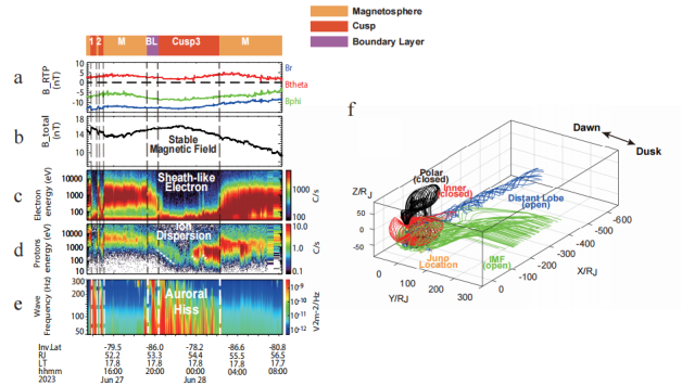 圖2?木星極尖區(qū)的原位觀測證據(jù)之一和朱諾探測器的位置示意圖。(a-e)朱諾探測器觀測證據(jù),從上到下依次為JSS坐標(biāo)系中的R-Theta-Phi磁場分量、總磁場強(qiáng)度、電子能譜數(shù)據(jù)、質(zhì)子能譜數(shù)據(jù)和等離子體波數(shù)據(jù);(f) 高精度模擬下木星的全球磁層拓?fù)浣Y(jié)構(gòu)和昏側(cè)的開放場構(gòu)型以及朱諾探測器的位置
