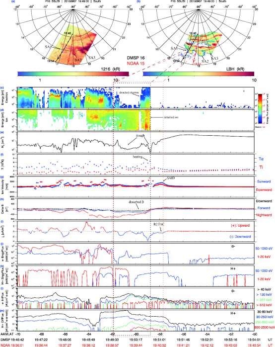為了解決這個問題,首先要精確探究直接形成鋸齒極光的粒子沉降模式。中國科學(xué)院地質(zhì)與地球物理研究所地球與行星物理院重點(diǎn)實(shí)驗室博士生周一甲與導(dǎo)師何飛研究員等,對一次中等地磁暴期間鋸齒極光的電離層特征進(jìn)行了綜合分析。之所以能分析,是因為四顆DMSP衛(wèi)星和一顆NOAA衛(wèi)星在30分鐘的時間內(nèi)依次穿過了不同鋸齒結(jié)構(gòu)的上方(圖1)。通過對低能和高能沉降粒子、磁場擾動、伴隨的亞極光極化流、場向電流等特征的研究,研究人員確定了鋸齒極光上方存在的特殊的粒子沉降特征(圖2),主要研究結(jié)論如下: