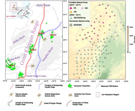 太平洋板塊在東亞地區(qū)下方深俯沖和地幔過(guò)渡帶內(nèi)停滯是一種獨(dú)特的構(gòu)造現(xiàn)象,是擴(kuò)展板塊構(gòu)造學(xué)說(shuō)的重要研究課題。前人研究主要集中于這個(gè)現(xiàn)象所導(dǎo)致的強(qiáng)烈近場(chǎng)效應(yīng),例如長(zhǎng)白山火山活動(dòng),而對(duì)其遠(yuǎn)場(chǎng)效應(yīng)知之甚少。大興安嶺地區(qū)位于我國(guó)東北地區(qū)的西緣,構(gòu)造上隸屬于中亞造山帶,受太平洋板塊深俯沖的遠(yuǎn)場(chǎng)效應(yīng)影響,自中生代以來(lái)經(jīng)歷了多期構(gòu)造運(yùn)動(dòng)及相應(yīng)的巖漿活動(dòng),導(dǎo)致了現(xiàn)今該地區(qū)復(fù)雜的地殼結(jié)構(gòu)。因此,獲取大興安嶺地區(qū)高分辨率地殼性質(zhì)圖像,厘清各期巖漿活動(dòng)在地殼中的殘留結(jié)構(gòu)信息,對(duì)于深入認(rèn)識(shí)太平洋板塊俯沖遠(yuǎn)場(chǎng)效應(yīng)的影響范圍及相關(guān)的動(dòng)力學(xué)過(guò)程十分重要。