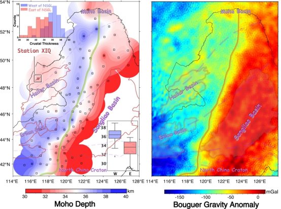 圖2 研究區(qū)域莫霍面深度分布圖以及布格重力異常分布圖(EGM2008, Pavlis et al., 2012)