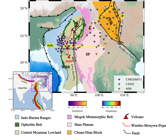 圖1 研究區(qū)域主要構造單元和臺站分布圖。左下角的插圖顯示了研究區(qū)域在印度-歐亞俯沖碰撞擠出系統(tǒng)中的位置。WBB: 西緬塊體;SP: 撣邦高原;CDB: 川滇塊體;KF: 卡巴斷裂;LJF: 麗江斷裂;XJF: 小江斷裂;WMP: 溫托-蒙育瓦-波帕火山弧。黑色粗虛線表示圖3中兩條剖面的空間位置