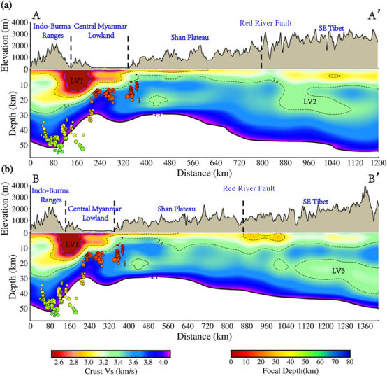 圖2 研究區(qū)域不同深度的剪切波速度 (Vs) 成像結果。24 km深的水平切片上,粉紅色虛線表示垂直長剖面 AA’ 和 BB’ 的位置。LV1-LV3 代表文中討論的低速異常。其中,位于緬甸弧前盆地的 LV1 在垂直長剖面中由2.5 km/s的虛線等值線描繪;青藏高原東南緣中下地殼的兩個低速異常 LV2和LV3則由 3.4 km/s的虛線等值線勾勒