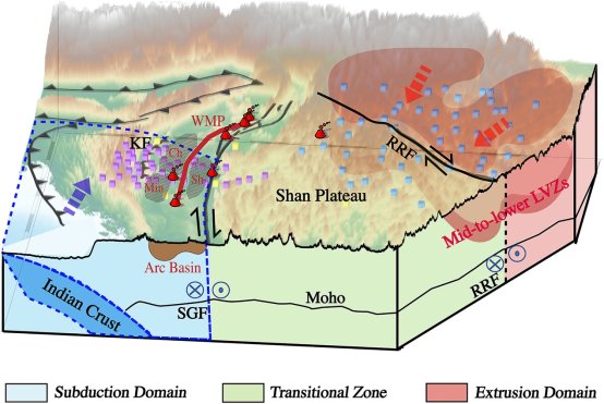 圖3 根據(jù)成像結果繪制的解釋模型示意圖,展示了西緬塊體、撣邦高原和青藏東南緣三個區(qū)域的不同構造反應。印度板塊的俯沖區(qū)域以淺藍色表示;紅河斷裂以北受構造擠出影響的區(qū)域以紅色表示,其低速異常的真實位置位于中下地殼,而三維地形圖上的紅色區(qū)域代表這些低速異常在地表的投影;撣邦高原位于俯沖與擠出的構造過渡區(qū),用綠色標記。紅色箭頭指示青藏高原東南緣中下地殼低速異常的延展方向,藍色箭頭顯示印度板塊的斜向俯沖方向