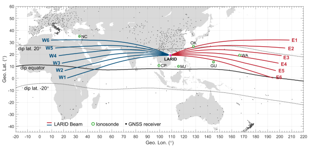 圖1. 位于海南東方臺站的LARID雷達極遠距離探測視場圖。藍色和紅色實線代表LARID西向和東向探測波束,黑點和綠圈代表對比研究中采用的GNSS接收機和電離層測高儀臺站位置。