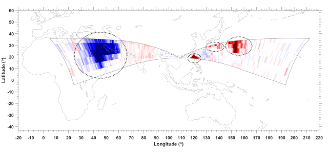 此次磁暴期間,LARID的東向波束和西向波束均探測到極遠距離的赤道等離子體泡。圖2顯示東向波束探測到的赤道等離子體泡位于西太平洋上空,分別距離LARID臺站1000-2000 km、3000-4500 km和5000-7000 km。西向波束探測到的赤道等離子體泡位于西亞-非洲上空,距離LARID臺站6000-9000 km。結(jié)合空間環(huán)境探測實驗室建設(shè)的IONISE觀測網(wǎng)和全球GNSS觀測網(wǎng),以及不同經(jīng)度區(qū)域的電離層測高儀觀測(見圖1站點分布),研究團隊對此次磁暴期間的大范圍赤道等離子體泡現(xiàn)象開展了機理分析。結(jié)果表明,在暴時電場等影響下,赤道電離層底部快速抬升,為赤道等離子體泡的產(chǎn)生提供了有利條件,分別在西太平洋和西亞-非洲上空產(chǎn)生赤道等離子體泡。