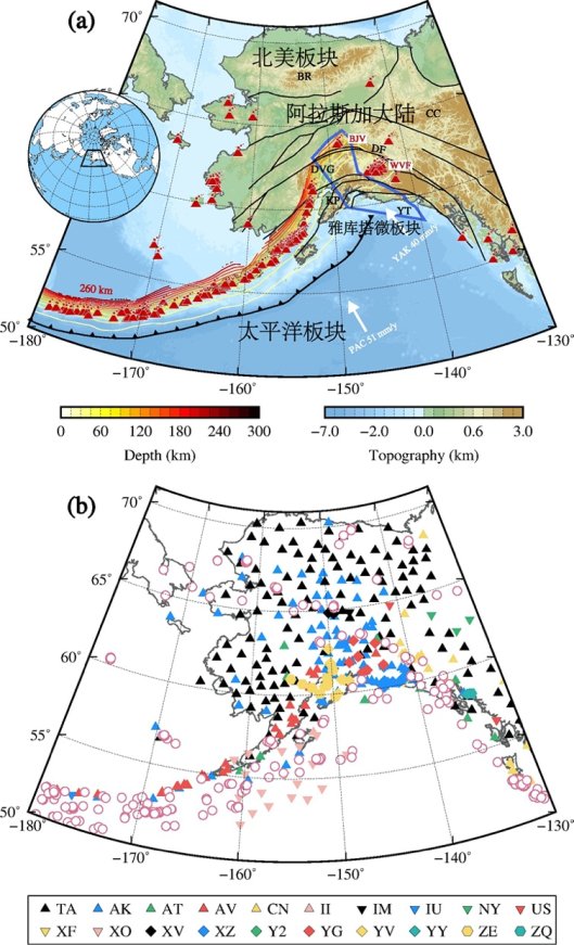 圖1 (a) 阿拉斯加大陸構(gòu)造背景圖。紅色三角形表示火山的位置。Slab 2.0模型提供了太平洋板塊俯沖深度等值線(Hayes et al.,2018)。雅庫塔微板塊表示為藍(lán)色多邊形。BR:Brooks山脈,BJV:Buzzard Creek Jumbo Dome火山,CC:加拿大山脈, DF:德納利斷層,DVG:德納里火山空區(qū),KP:Kenai半島,WVF:蘭格爾火山群;(b) 地震事件 (紅色空心圓) 和臺(tái)站分布