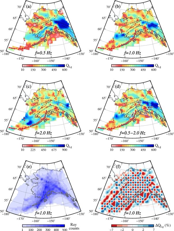 中國(guó)科學(xué)院地質(zhì)與地球物理研究所地球與行星物理重點(diǎn)實(shí)驗(yàn)室地震學(xué)學(xué)科組的博士研究生楊庚、導(dǎo)師趙連鋒研究員、美國(guó)加州大學(xué)圣克魯茲分校的謝小碧研究員與其他合作者一起,基于阿拉斯加和加拿大密集地震臺(tái)陣觀測(cè)數(shù)據(jù) (圖1b),構(gòu)建了寬頻帶、高分辨率 (1°×1°) 的Lg波Q值模型 (圖2),并用此信息推斷了阿拉斯加大陸的地殼熱結(jié)構(gòu)。