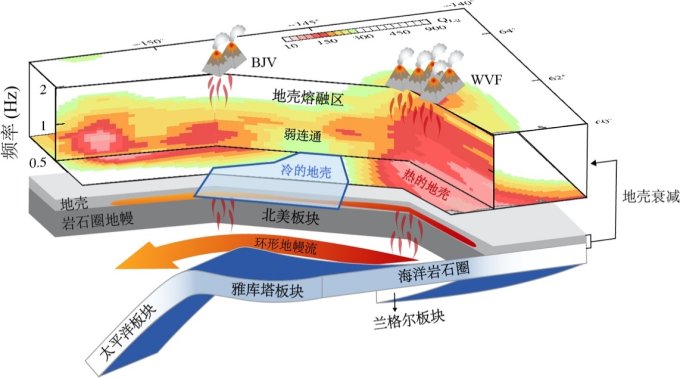 Q值成像結(jié)果表明,較強(qiáng)的Lg波衰減所揭示的地殼熱異常與地表火山活動(dòng)具有良好的對(duì)應(yīng)關(guān)系 (圖3),雅庫塔地體中部地殼則表現(xiàn)為弱衰減特征。這表明雅庫塔平板俯沖可能冷卻了地幔楔,并阻止了熱幔物質(zhì)侵入地殼。阿留申弧火山、Buzzard Creek-Jumbo Dome火山和蘭格爾火山群下方地殼為顯著的低Q值異常。相比之下,德納利火山空區(qū)下方地殼表現(xiàn)為弱衰減、高Q值特征 (圖3a-圖3b)。因此,火山空區(qū)下方地殼中并不存在足夠的熔體以形成火山活動(dòng),與地表火山缺失現(xiàn)象一致。強(qiáng)衰減異常不僅存于火山下方,WVF火山群和BJV火山下方的低Q異常分別向南北和東西方向延伸,并存在弱連通現(xiàn)象。這可能說明地殼內(nèi)存在潛在的環(huán)形熔融,連接著WVF和BJV下方的巖漿囊 (圖4)。該1/4環(huán)狀地殼熔融的形成可能與雅庫塔板塊周緣的環(huán)形地幔流攜帶的熱物質(zhì)有關(guān)。