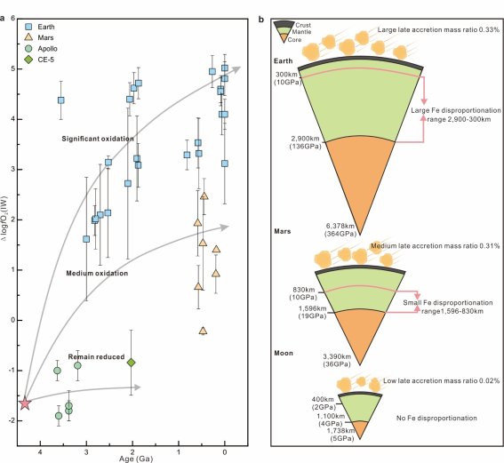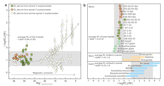 圖1 CE-5玄武巖揭示的月幔氧逸度(a)與地球和火星的對(duì)比(b)