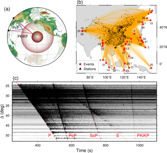 中國科學(xué)院地質(zhì)與地球物理所地球與行星物理學(xué)科中心博士畢業(yè)生章浩東與博士生崔天宇、導(dǎo)師艾印雙研究員利用中國數(shù)字地震臺網(wǎng)2009-2018年期間記錄的1014個寬頻帶地震臺站數(shù)據(jù),拾取到4272條具有清晰地球內(nèi)外核反射震相對(PcP和PKiKP)波形記錄(圖1),分析了地核反射震相的走時殘差分布和波形相似性,獲得了東亞地區(qū)下方內(nèi)核邊界精細結(jié)構(gòu)的新認識。