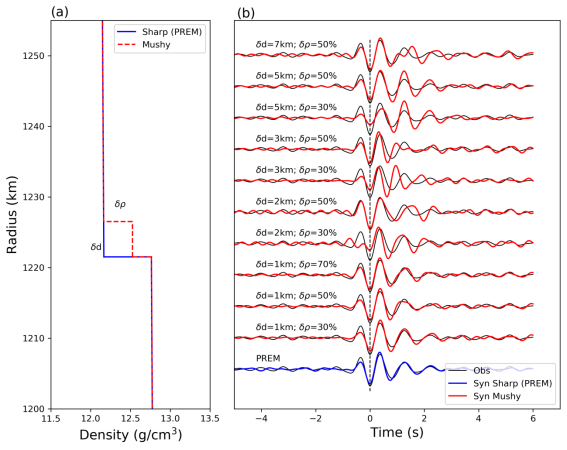 圖2 PKiKP波形受不同內(nèi)核邊界參數(shù)影響。(a)存在糊狀層內(nèi)核邊界的密度剖面圖。該剖面穿過內(nèi)核邊界(紅色虛線),以兩個參數(shù)描述:表示糊狀層厚度,表示相對于PREM模型(藍色線所示)在內(nèi)核邊界處糊狀層的密度躍變值;(b) 理論PKiKP波形。通過一系列具有糊狀層的內(nèi)核邊界模型生成的合成波形(紅色波形)與尖銳內(nèi)核邊界PREM模型的波形(藍色波形)的對比,其中黑色波形表示觀測到的PKiKP波形