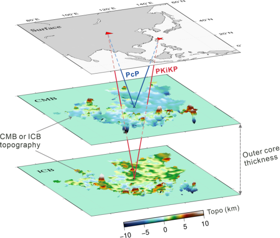 圖3 本研究地核反射震相觀測數(shù)據(jù)的解釋模型:外核厚度變化或核幔邊界/內(nèi)核邊界的地形起伏。紅線表示在內(nèi)核邊界(ICB)反射的PKiKP射線路徑,而藍線表示在核幔邊界(CMB)反射的PcP射線路徑;它們由地震(紅色五角星)激發(fā)并被臺站(紅色三角形)記錄