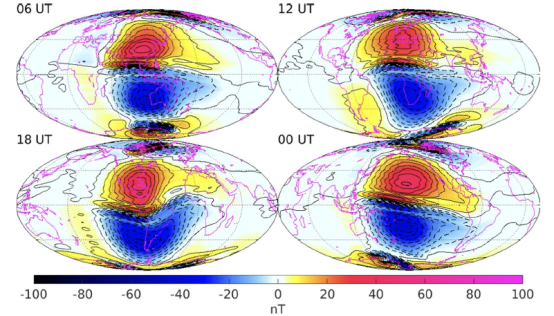 早在1722年,英國(guó)物理學(xué)家喬治·格雷厄姆(George Graham)通過觀察磁針的方向變化注意到地磁場(chǎng)在一天內(nèi)存在規(guī)律性的變化,即地磁場(chǎng)日變化,并推測(cè)這些變化可能與存在空間電流有關(guān)。19世紀(jì)20年代,挪威科學(xué)家克里斯蒂安·伯克蘭(Kristian Birkeland)提出了電離層電流的概念,他認(rèn)為太陽(yáng)電磁輻射能電離高層大氣,形成電離層。在這個(gè)電離層中,高層大氣的潮汐運(yùn)動(dòng)帶動(dòng)帶電粒子與地磁場(chǎng)發(fā)生切割作用,進(jìn)而驅(qū)動(dòng)產(chǎn)生了電離層電流。進(jìn)入衛(wèi)星時(shí)代以來(lái),人們通過大量衛(wèi)星的觀測(cè)數(shù)據(jù),如SWARM,CHAMP等地磁衛(wèi)星的數(shù)據(jù),能較為準(zhǔn)確地獲得電離層電流的空間分布和及其隨時(shí)間變化的規(guī)律(圖1)。