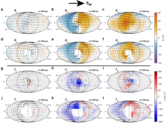 與地球不同,火星沒有全球性的偶極磁場(chǎng),但廣泛分布有較強(qiáng)的巖石剩磁,外部太陽(yáng)風(fēng)會(huì)直接與火星大氣/電離層發(fā)生相互作用。此外火星也同樣存在有大氣,也同樣存在由太陽(yáng)電磁輻射加熱驅(qū)動(dòng)的高層大氣潮汐風(fēng)場(chǎng)及電離層。那火星是否也存在有類似地球一樣的電離層電流?假若存在,其物理成因是否也與地球電離層電流的一致?