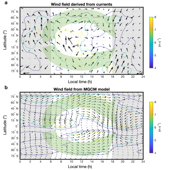 為了揭示火星電離層電流體系的分布,中國(guó)科學(xué)院地質(zhì)與地球物理研究所高佳維博士后與合作導(dǎo)師戎昭金研究員、魏勇研究員等首次刻畫了火星電離層高度的磁場(chǎng)和電流分布特征。由于火星擁有區(qū)域性的巖石剩磁,為了避免巖石磁場(chǎng)對(duì)空間電流體系的干擾,他們根據(jù)MAVEN衛(wèi)星的觀測(cè)數(shù)據(jù),僅使用了無(wú)顯著巖石剩磁區(qū)域的觀測(cè)數(shù)據(jù),進(jìn)一步計(jì)算了電離層電流和電場(chǎng)的分布規(guī)律。研究結(jié)果表明火星的電離層電流主要沿著水平方向分布,而垂直方向電流強(qiáng)度較小?;鹦堑碾婋x層中同時(shí)存在兩種電流體系。一種是由電離層上方的太陽(yáng)風(fēng)驅(qū)動(dòng),其特點(diǎn)是驅(qū)動(dòng)的電流主要沿著太陽(yáng)風(fēng)電場(chǎng)的方向(圖3),并伴隨著晨昏的電流不對(duì)稱性。另一種由電離層下方的中性潮汐風(fēng)場(chǎng)驅(qū)動(dòng)的,其特點(diǎn)是驅(qū)動(dòng)的電流分布與年平均的中性風(fēng)場(chǎng)分布形態(tài)近似相同,由晨側(cè)赤道處沿高緯度傳輸至昏側(cè)赤道處,并伴有季節(jié)性的電流強(qiáng)度變化。通過求解電離層電動(dòng)力學(xué)方程 ,研究表明火星電離層中電場(chǎng)項(xiàng)()要比漂移項(xiàng)大幾個(gè)數(shù)量級(jí),因此在無(wú)巖石剩磁區(qū)域,電離層電場(chǎng)是電離層電流的主要驅(qū)動(dòng)源。此外,目前對(duì)火星的中性風(fēng)場(chǎng)缺乏實(shí)際觀測(cè),他們還提出了一種利用電離層電流來(lái)反演火星大氣平均風(fēng)場(chǎng)的方法(圖4),其結(jié)果與MGCM火星大氣模式導(dǎo)出的風(fēng)場(chǎng)結(jié)果在全球分布上非常接近,證明了利用衛(wèi)星磁場(chǎng)數(shù)據(jù)反演大氣風(fēng)場(chǎng)的可行性。