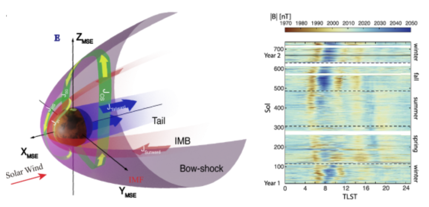 圖2 (左)火星感應(yīng)磁層電流體系示意圖,其主要由磁層頂電流體系和磁尾電流體系構(gòu)成;(右)InSight火星車觀測(cè)的火星表面磁場(chǎng)隨地方時(shí)的變化