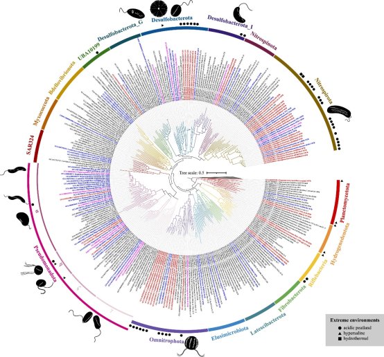 圖1 趨磁細(xì)菌的系統(tǒng)發(fā)育樹(shù)。最外圈展示了17個(gè)細(xì)菌門(mén)和代表性趨磁細(xì)菌的形態(tài)。內(nèi)圈展示細(xì)菌名稱(chēng),紅色代表從極端環(huán)境中獲得的趨磁細(xì)菌、洋紅色代表已進(jìn)行形態(tài)學(xué)觀(guān)察的趨磁細(xì)菌、藍(lán)色代表已獲得基因組草圖的趨磁細(xì)菌、黑色代表非趨磁細(xì)菌。特定極端環(huán)境中獲得的趨磁細(xì)菌用不同形狀指示,圓形表示酸性泥炭地,三角形表示高鹽環(huán)境,正方形表示熱液環(huán)境