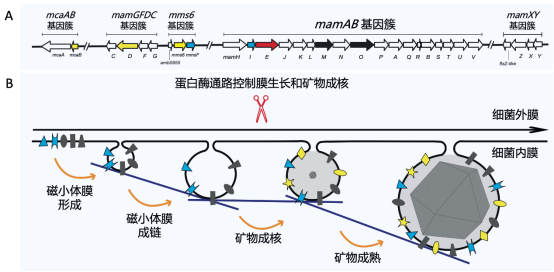 圖2 模式趨磁細(xì)菌AMB-1中磁小體礦化機(jī)制。(A) AMB-1中參與磁小體礦化的五個(gè)關(guān)鍵基因簇。(B) 磁小體合成的不同步驟。藍(lán)色和黃色表示不同蛋白質(zhì)在不同階段靶向到合成磁小體的細(xì)胞內(nèi)膜上,紅色表示MamE蛋白酶介導(dǎo)控制磁小體膜生長(zhǎng)和礦物成核的調(diào)控通路