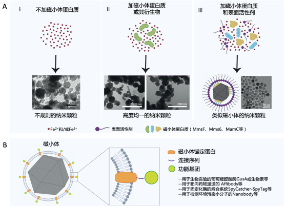 圖3 磁小體的應(yīng)用。(A)三種不同磁性納米顆粒體外合成的策略:不添加磁小體蛋白(A-i)、僅添加磁小體蛋白(A-ii)以及同時(shí)添加磁小體蛋白與表面活性劑(A-iii)。(B) 通過(guò)對(duì)磁小體錨定蛋白進(jìn)行遺傳修飾,將特定功能基團(tuán)連接到磁小體表面,實(shí)現(xiàn)磁小體在不同領(lǐng)域的應(yīng)用