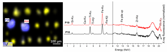 本研究首先利用單顆粒顯微操作技術(shù),將嫦娥五號(hào)月球樣品制備成單顆粒陣列。接著,使用μXRF技術(shù)對(duì)樣品陣列進(jìn)行了無損、無污染的快速掃描分析,獲取了所有顆粒的化學(xué)元素組成及其分布圖像(圖1)。通過半定量譜學(xué)分析,研究團(tuán)隊(duì)挑選出了兩個(gè)鈦鐵礦顆粒(P18和P19),為后續(xù)的詳細(xì)分析提供了樣本基礎(chǔ)。
