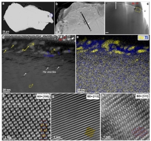圖4 太陽(yáng)風(fēng)輻射引起的鈦鐵礦缺陷(氦泡)的化學(xué)成分與顯微結(jié)構(gòu)。