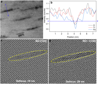 相比之下,受到太陽(yáng)風(fēng)輻射作用的鈦鐵礦顆粒P19則呈現(xiàn)出不同的微結(jié)構(gòu)特征:表面富含Si的非晶化沉積層、富含單質(zhì)鐵和鈦氧化物的層、定向排列的缺陷(氦泡),以及仍保持良好結(jié)晶的鈦鐵礦基體(圖3)。值得注意的是,本研究利用集成微分相襯掃描透射電子顯微鏡技術(shù)(iDPC-STEM),從原子尺度揭示了太陽(yáng)風(fēng)粒子注入導(dǎo)致的定向缺陷的化學(xué)和顯微特征(圖4)。由此可見,太陽(yáng)風(fēng)輻射不僅在鈦鐵礦中留下了物理徑跡,還引發(fā)了鈦鐵礦的化學(xué)分異,促成了單質(zhì)鐵和鈦氧化物(銳鈦礦)的形成。