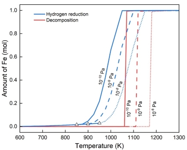 圖5 鈦鐵礦分解(代表熔體沖擊作用)和氫還原(代表太陽(yáng)風(fēng)輻射作用)的熱力學(xué)計(jì)算結(jié)果。