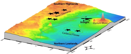 圖1?火星南北二分結(jié)構(gòu)的地形圖和火星震(五角星)位置圖。“洞察”號(hào)(InSight)位于北部低地,靠近Elysium Mons火山。前期“洞察”號(hào)團(tuán)隊(duì)定位的火星震主要位于北半球Cerberus Fossae區(qū)域,本研究首次定位的一簇火星震位于南半球Terra Cimmeria區(qū)域。南部高地:Southern Highlands,北部低地:NothernLowlands,二分結(jié)構(gòu)邊界:dichotomy boundary