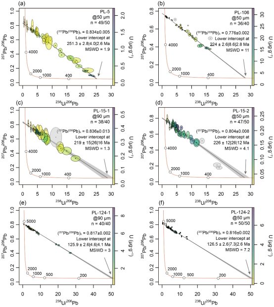 圖1 方解石U-Pb定年結(jié)果。年齡不確定性為2σ;MSWD:平均標(biāo)準(zhǔn)權(quán)重偏差;灰色圖標(biāo)表示被舍棄的數(shù)據(jù)點(diǎn);子圖右側(cè)的顏色條表示鈾(U)濃度