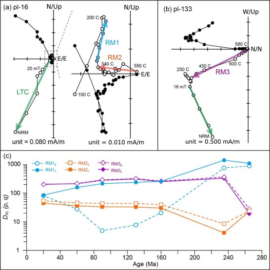通過地質(zhì)地球所多接收-電感耦合等離子體質(zhì)譜實(shí)驗(yàn)室和南方海洋科學(xué)與工程廣東省實(shí)驗(yàn)室(珠海)的方解石U-Pb年代學(xué)獨(dú)立分析,交叉驗(yàn)證結(jié)果表明,蓬萊灘剖面碳酸鹽巖至少經(jīng)歷了三期成巖過程,其年代分別為~126 Ma(早白堊世)、~223 Ma(晚三疊世)和~251 Ma(晚二疊世)(圖1)。此外,系統(tǒng)的熱退磁分析顯示,蓬萊灘剖面碳酸鹽巖樣品在清除低溫粘滯剩磁分量后,存在三期不同的剩磁分量(RM1、RM2、RM3)(圖2a-圖2b)。通過計(jì)算RM1、RM2和RM3三組分量對(duì)應(yīng)的古地磁極,并與華南板塊的視極移曲線進(jìn)行對(duì)比,計(jì)算二者之間的差異度(DKL(p,q)),結(jié)果表明:RM1和RM2為后期重磁化分量,其磁化時(shí)期分別為白堊紀(jì)和晚三疊世;而RM3為晚二疊世的原生剩磁分量(圖2c)。古地磁和方解石U-Pb定年兩種獨(dú)立方法的相互驗(yàn)證表明,蓬萊灘剖面至少經(jīng)歷了三期磁化作用,分別發(fā)生在晚二疊世、晚三疊世和早白堊世。結(jié)合巖石磁學(xué)和電子顯微學(xué)分析指示流體作用是導(dǎo)致發(fā)生重磁化的主要因素。此外,根據(jù)RM3分量計(jì)算獲得的虛地磁極緯度顯示,蓬萊灘剖面上段牙形石Jinogondolella granti帶到Clarkina dukouensis帶下段以負(fù)極性為主,表明瓜德魯普統(tǒng)-樂平統(tǒng)界線位于負(fù)極性帶內(nèi)部,為中-晚二疊世之交的全球海-陸地層對(duì)比提供了新的依據(jù)。