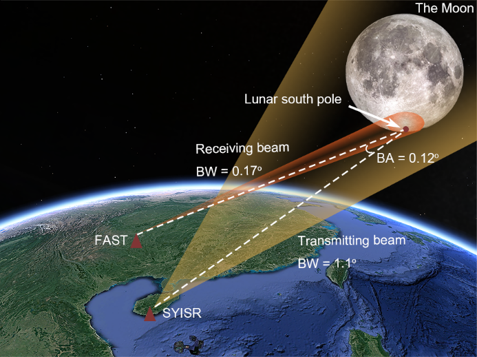 圖1 三亞非相干散射雷達(dá)(SYISR)和500米口徑球面射電望遠(yuǎn)鏡(FAST)地基雙站雷達(dá)月球成像實(shí)驗(yàn)觀測(cè)幾何示意圖。注:BA:雙站角。BW:波束寬度。