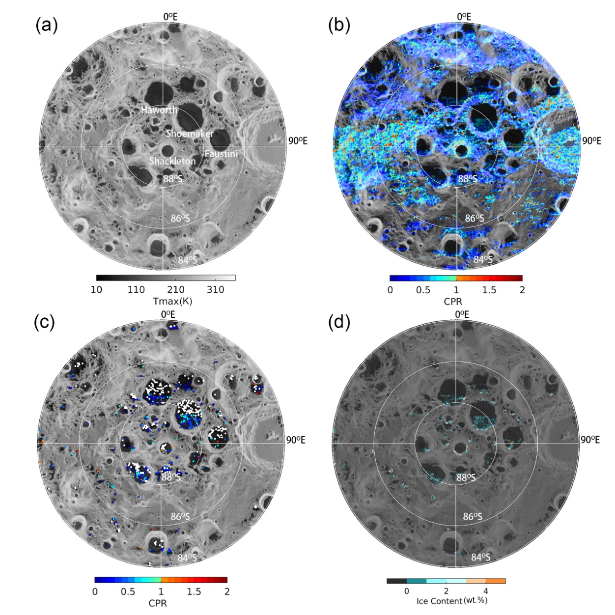 圖2. 月球南極地區(qū)(84°-90°S)的多手段數(shù)據(jù)綜合分析圖以及水冰含量分布圖。(a),月球南極地區(qū)的全年月表最高溫度圖,低于110K為冷井,提供了水冰長(zhǎng)期保存的環(huán)境。(b),雷達(dá)圓極化比(CPR)圖疊加在全年月表最高溫度圖上,雷達(dá)陰影區(qū)沒有圓極化比信息,因此無(wú)顏色覆蓋。(c),全年月表最高溫度圖上標(biāo)記月球礦物成像儀(M3)識(shí)別的月表暴露水冰位置,顏色代表通過插值計(jì)算的雷達(dá)CPR值,白點(diǎn)代表位于雷達(dá)陰影中的M3水冰位置,因此沒有CPR信息。(d),水冰含量上限分布圖疊加在全年月表最高溫度圖上,顏色代表水冰含量。