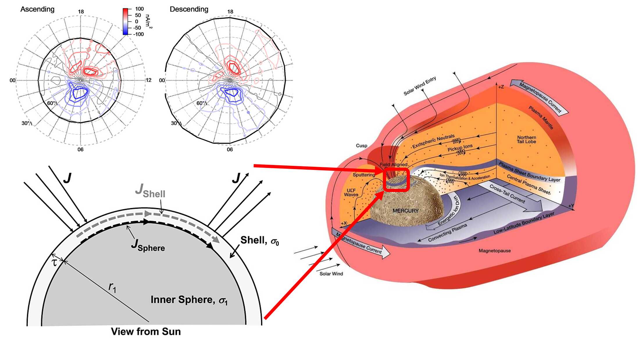 圖3 水星場(chǎng)向電流的統(tǒng)計(jì)分布(左上),其閉合路徑(左下),以及水星磁層示意圖(右)